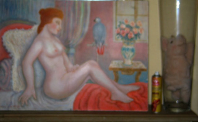 Dans un rapport trouble, une femme charnelle et nue, alitée sur une toile huilée, s'offre à un cochon dressé en une prison de verre sur la pierre froide
